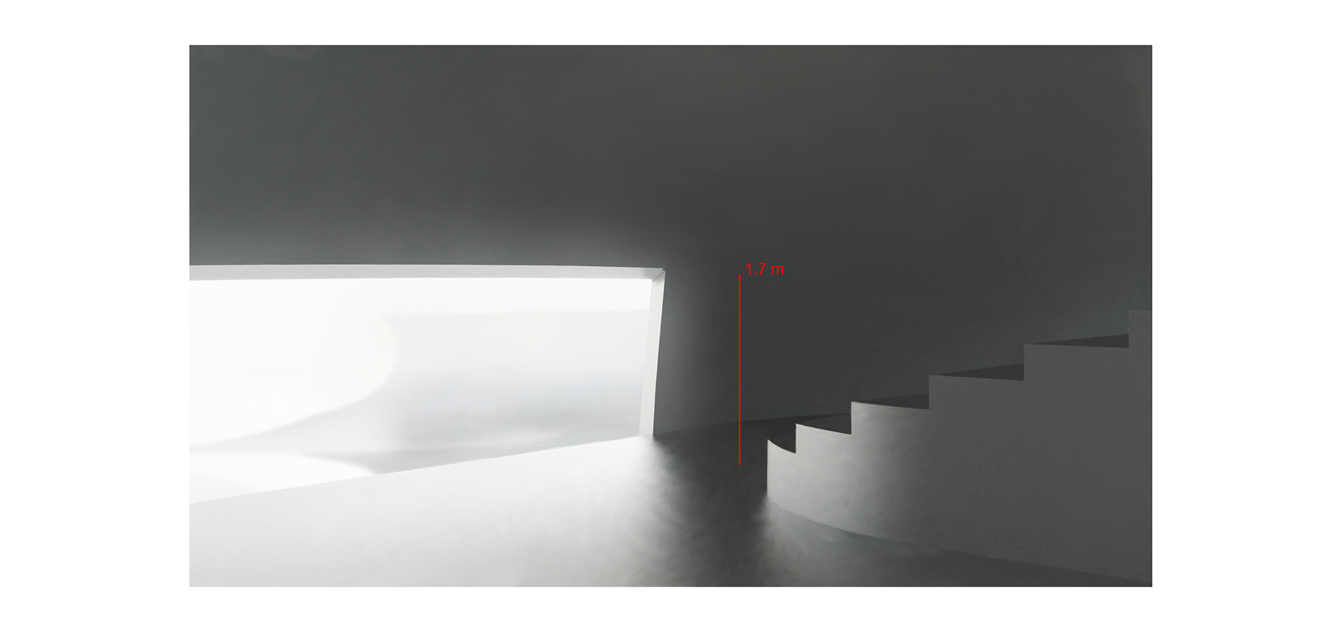 the ground level area features a main entrance and two terraces on opposite sides, as well as a kitchenette, multipurpose area and half bathroom under a staircase. the upper level features a walking closet, bathroom and sleeping quarters under a roof window that projects natural light in the absence of windows for a cavern-like effect.