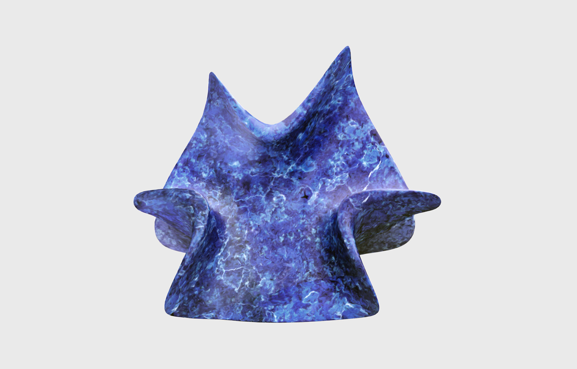 built with a combination of CNC technologies with manual techniques from a single block, the blue marble seat weights around half a ton, featuring three seating positions of different lengths converging in a central area for multipurpose use. the prominent use of curves and natural materials blend the structure to organic settings; when indoors, its serves as a central modulating element for its volume and layout.